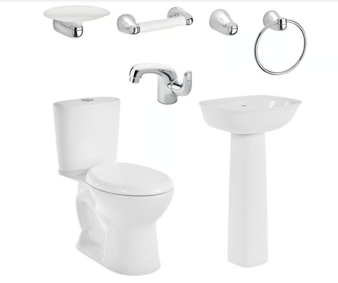 Combo con sanitario, Lavamanos con pedestal, Accesorios y grifería